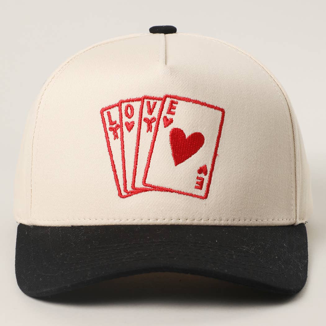 A playful embroidered design featuring a hand of LOVE-themed playing cards, accented with a bold heart. A charming mix of fun and romance, perfect for adding a cute Valentine touch to any look. This 5-panel two-tone trucker cap is made from 100% cotton canvas, offering both durability and breathability. Designed with a structured fit and classic silhouette, it features high-quality embroidery, finished in the USA. The adjustable snapback closure ensures a comfortable fit for most head sizes. With its timeless design and versatile color combinations, this is a dependable cap for effortless everyday wear.